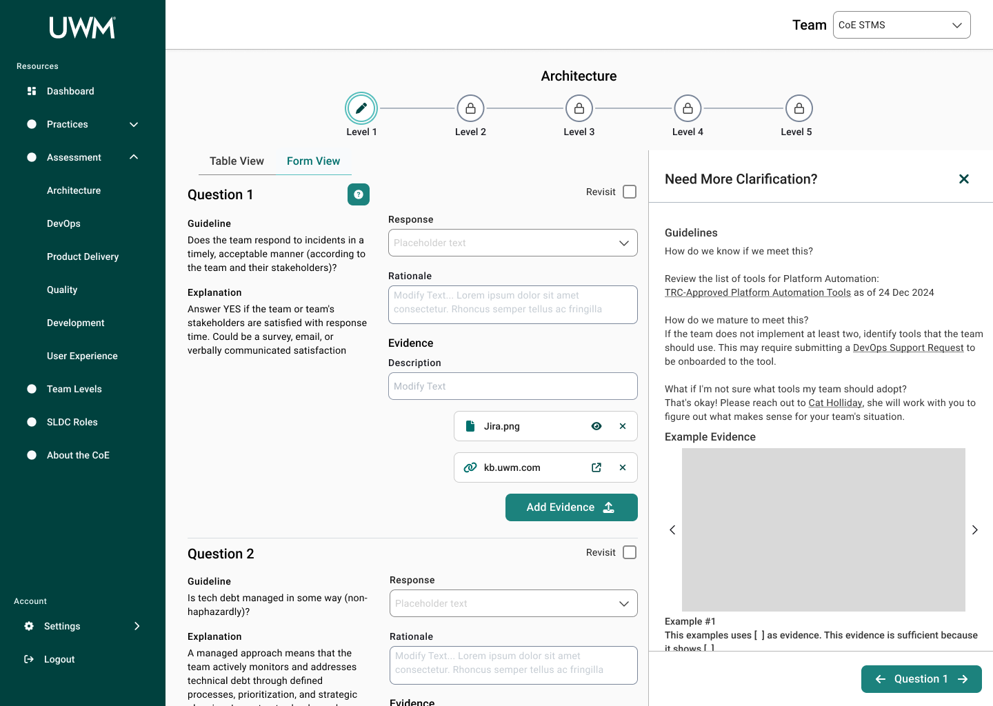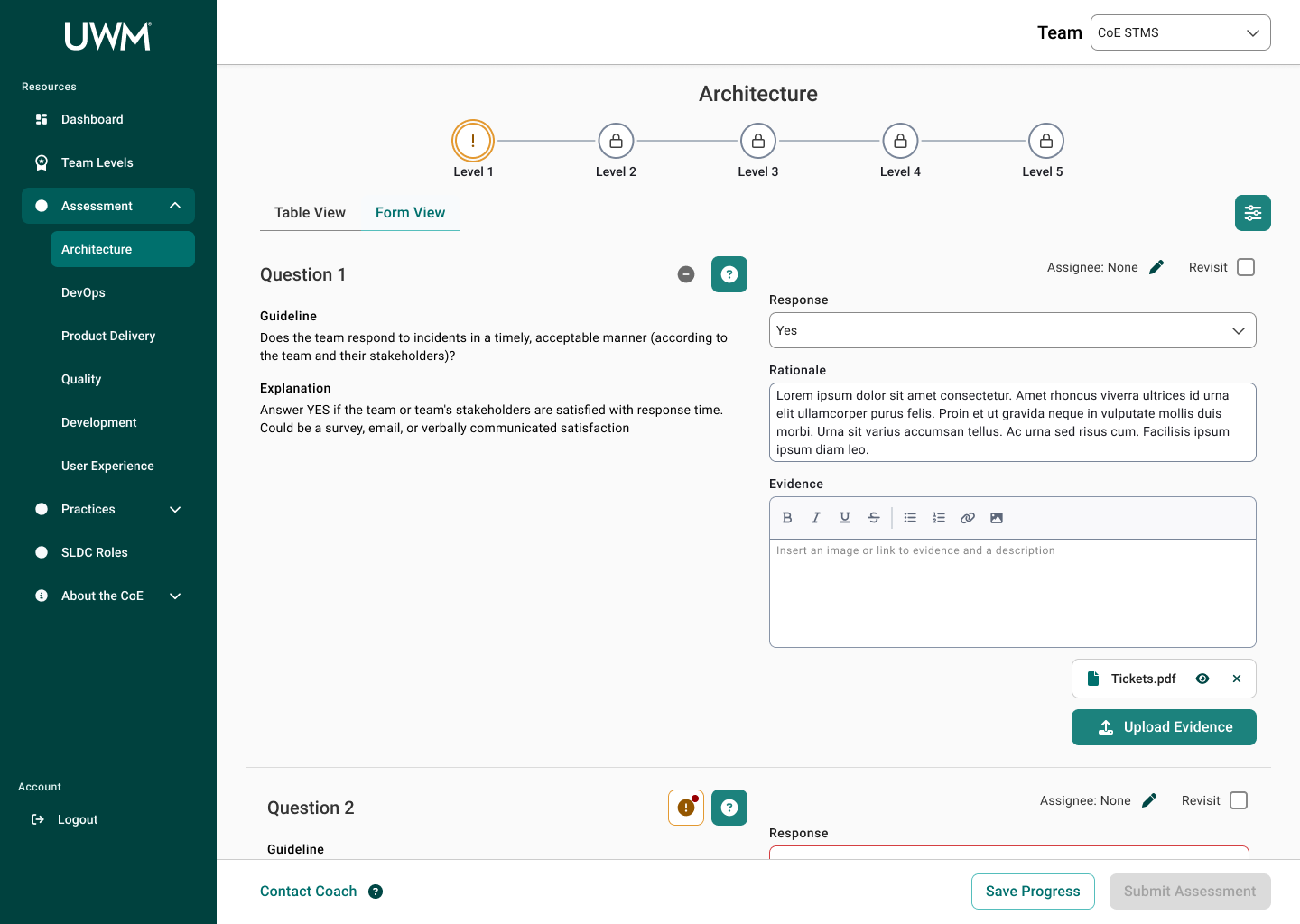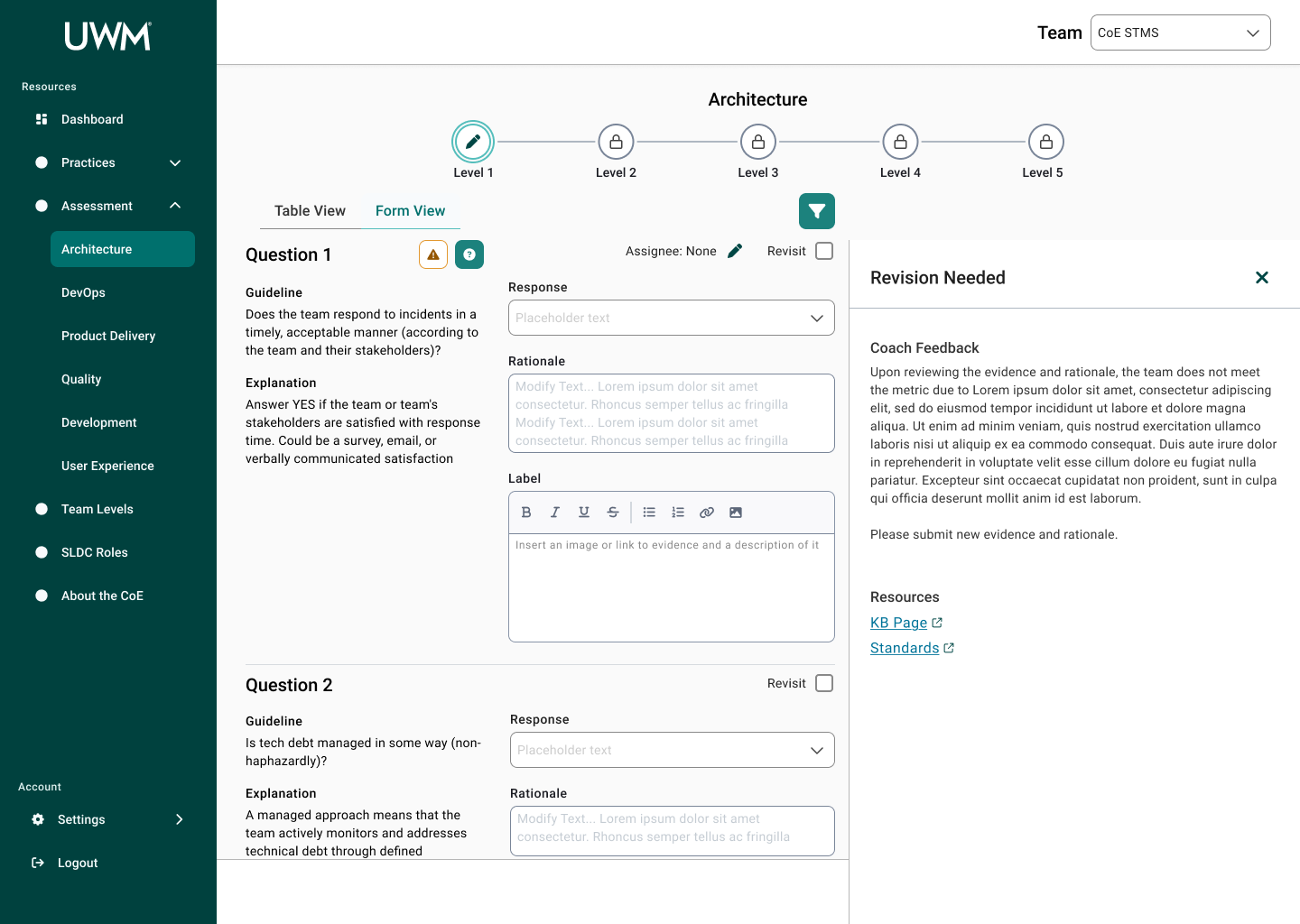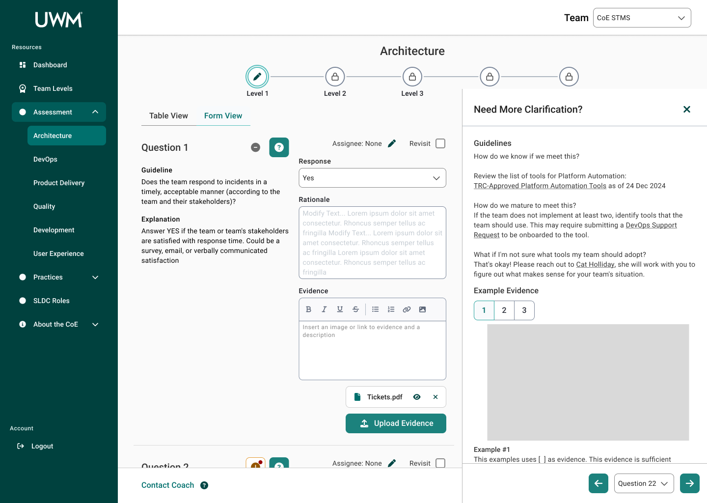 When Christina visits the site again, she sees there is feedback for the questions she submitted previously. She notices there are two questions she needs to revisit. In the Form View, she sees that a coach has made a comment on their answer. She views their rationale and further information through the Revision Needed drawer. Using the information the coach provided, she uploads new evidence for those questions. Looking ahead, she looks at the next levels for Architecture to see what the team needs to be working towards.