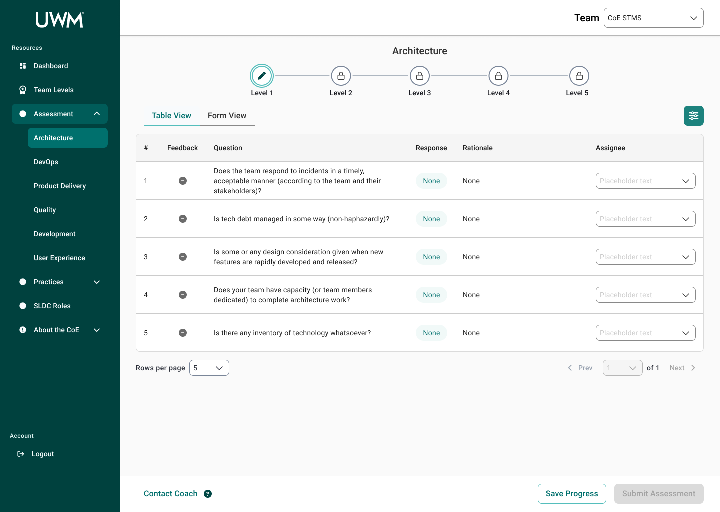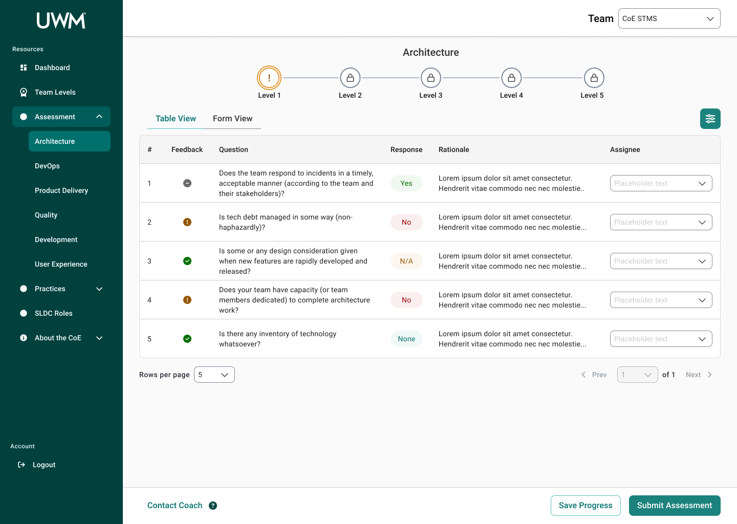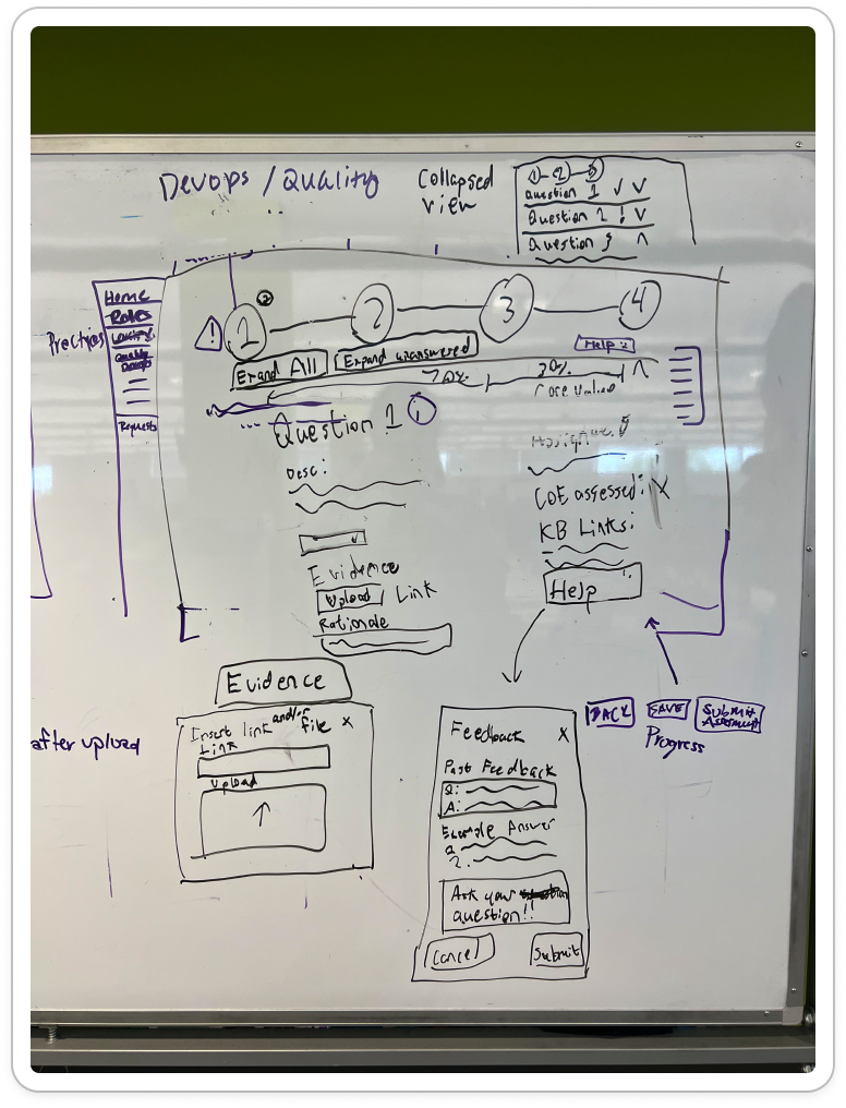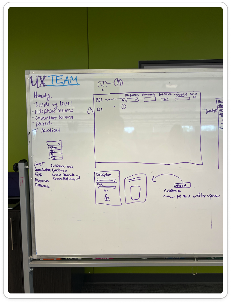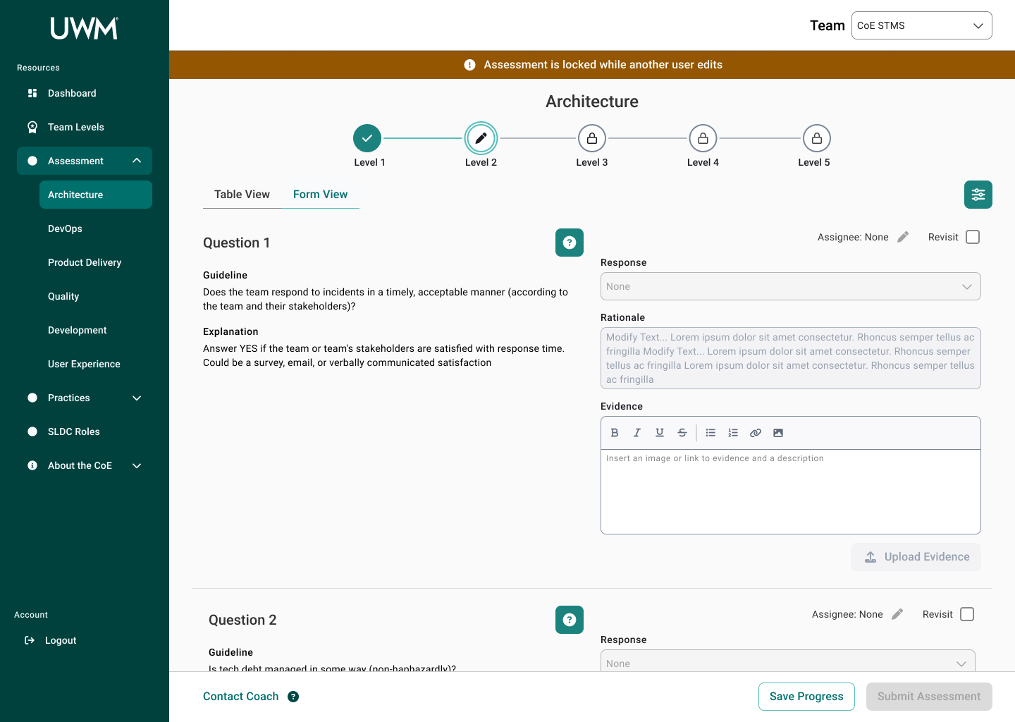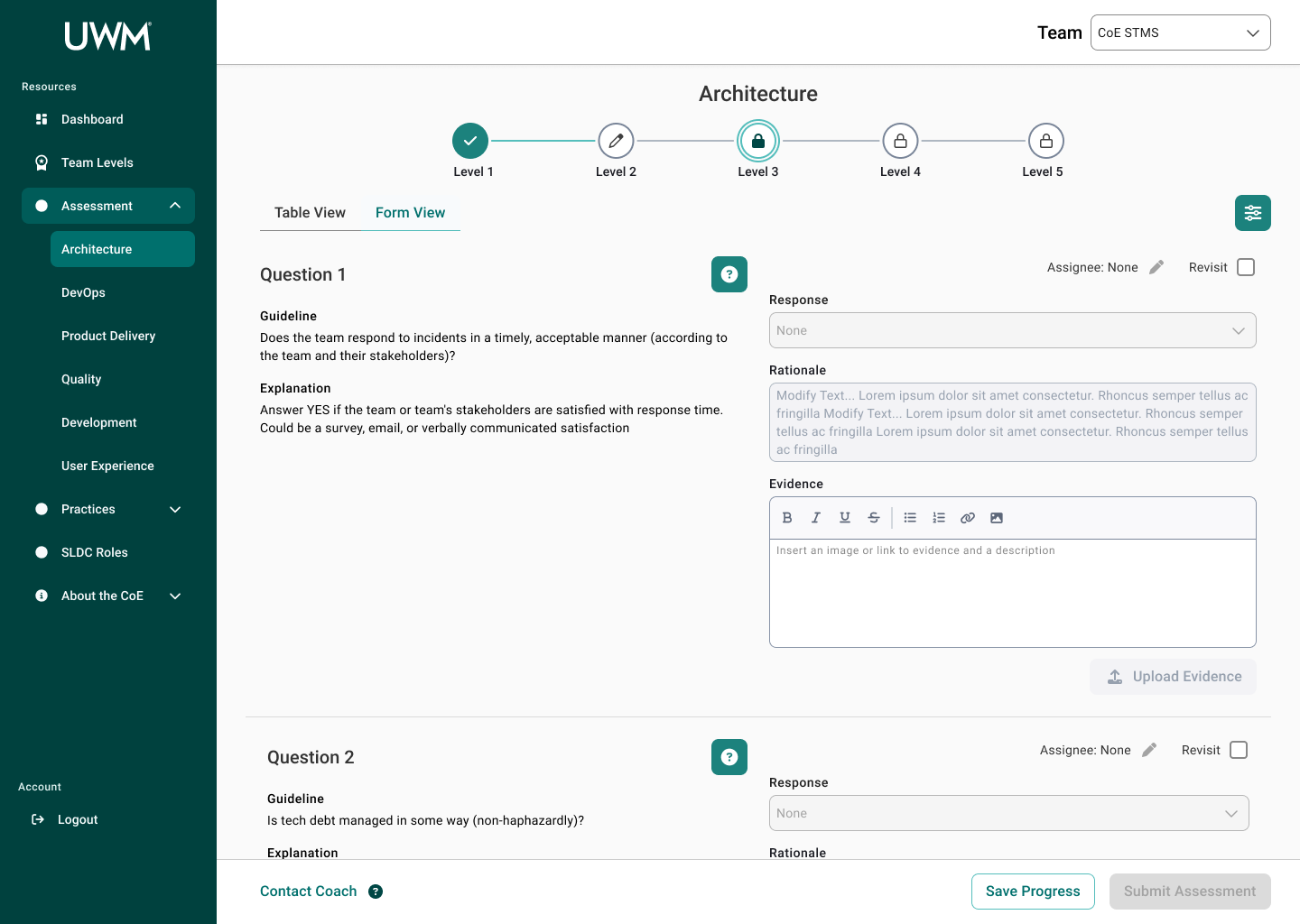 Over the course of this project, I collaborated with many team members, including researchers, designers, and stakeholders to redesign the CoE application for teams to complete assessments to measure their maturity for SDLC standards. This new design will allow teams to efficiently complete assessments, receive coaching feedback, and improve their development practices. In turn, the development teams at UWM can be more cost-effective and time-efficient while also reducing risk.