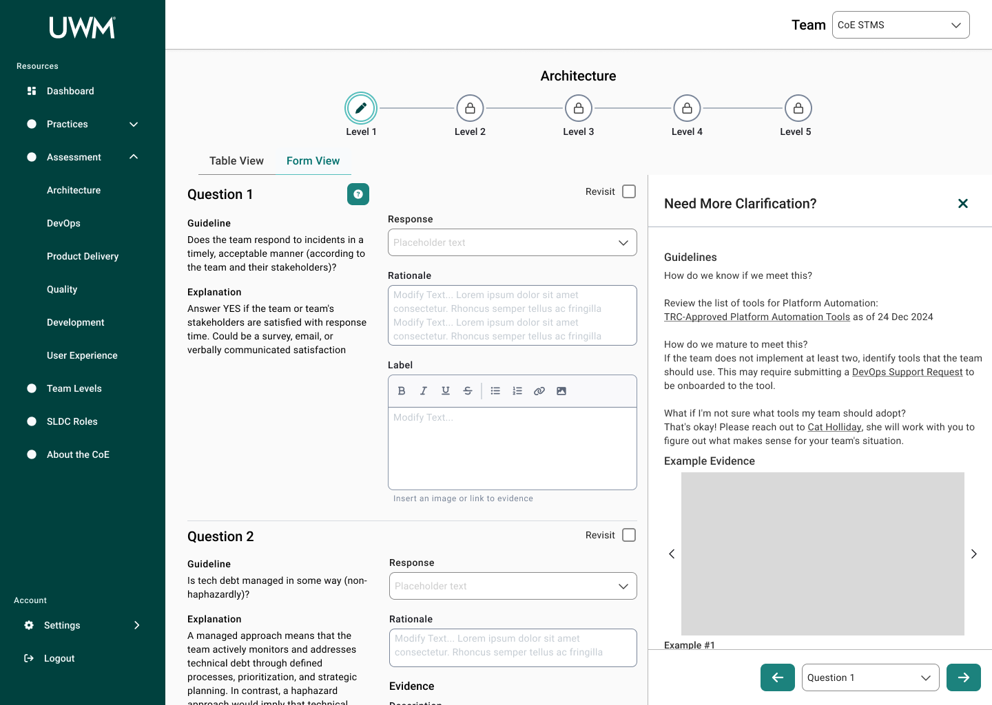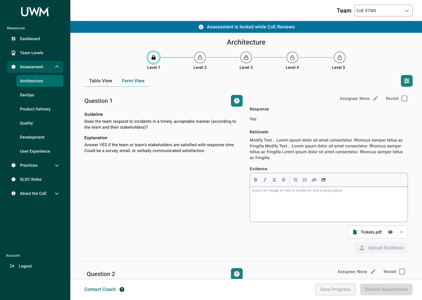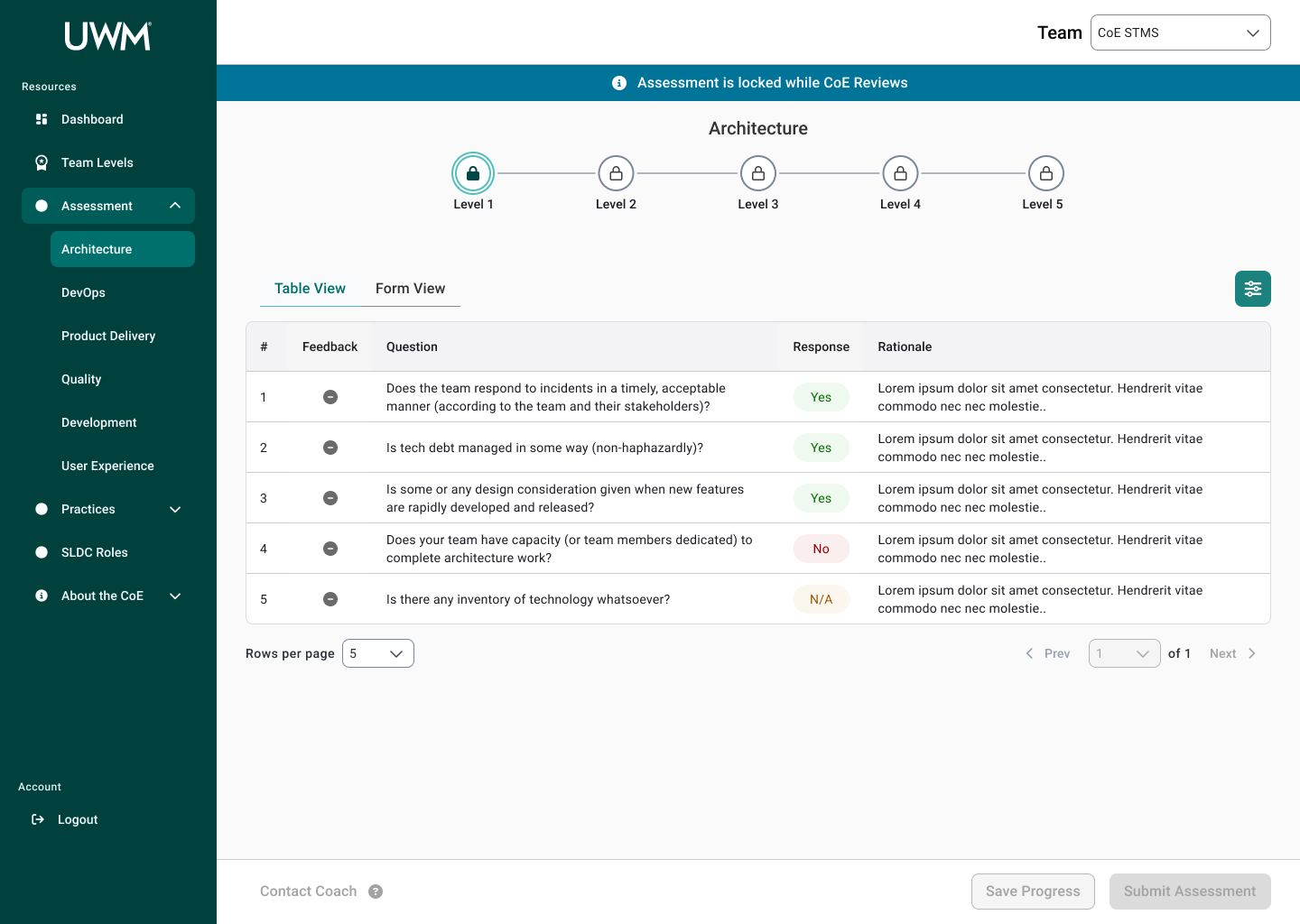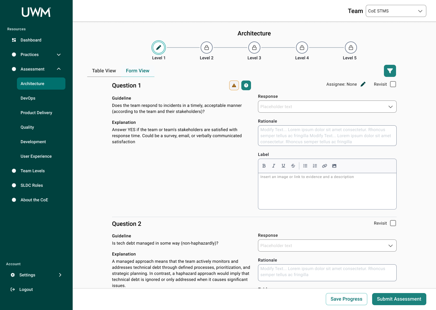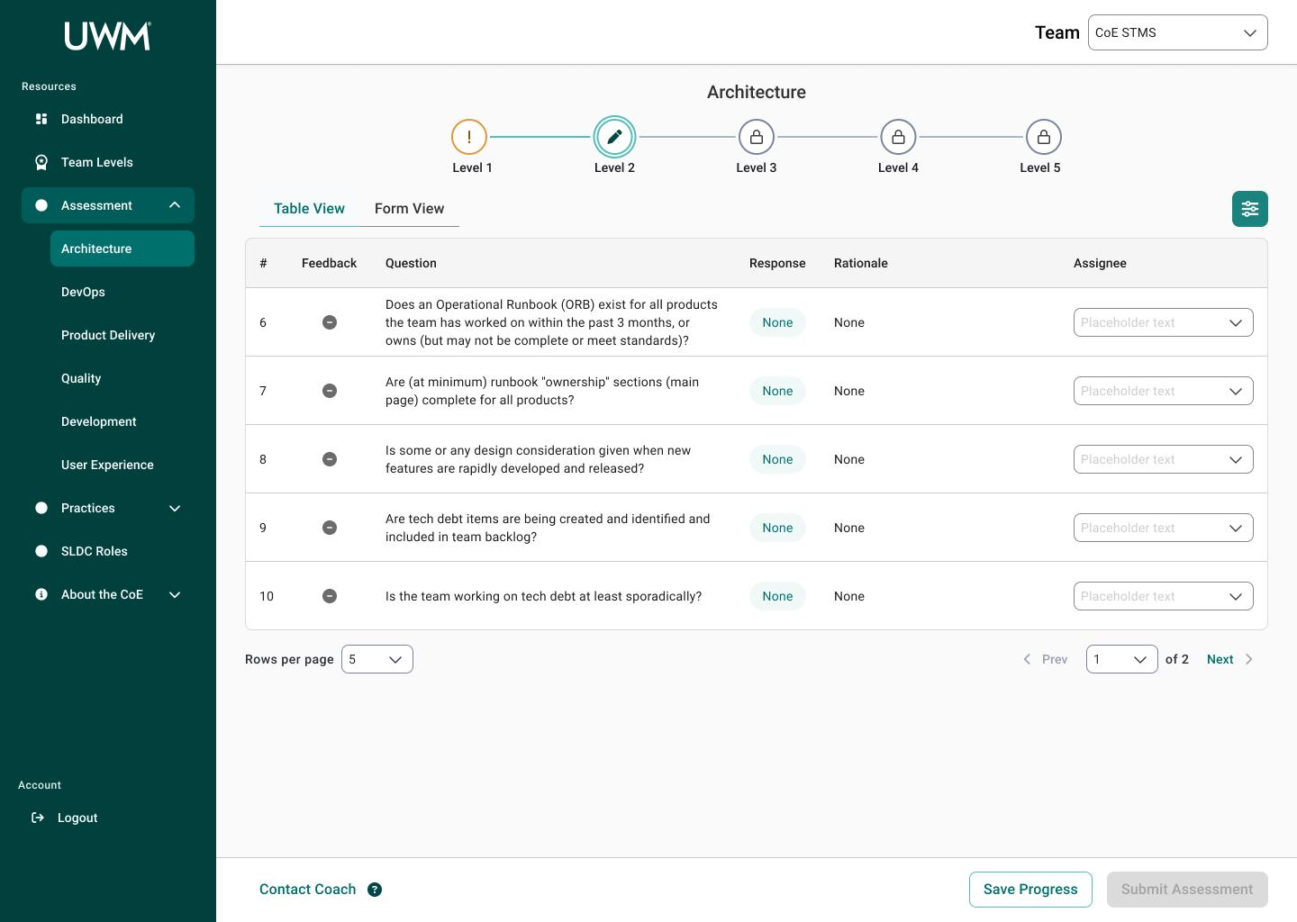 Over the course of this project, I collaborated with many team members, including researchers, designers, and stakeholders to redesign the CoE application for teams to complete assessments to measure their maturity for SDLC standards. This new design will allow teams to efficiently complete assessments, receive coaching feedback, and improve their development practices. In turn, the development teams at UWM can be more cost-effective and time-efficient while also reducing risk.