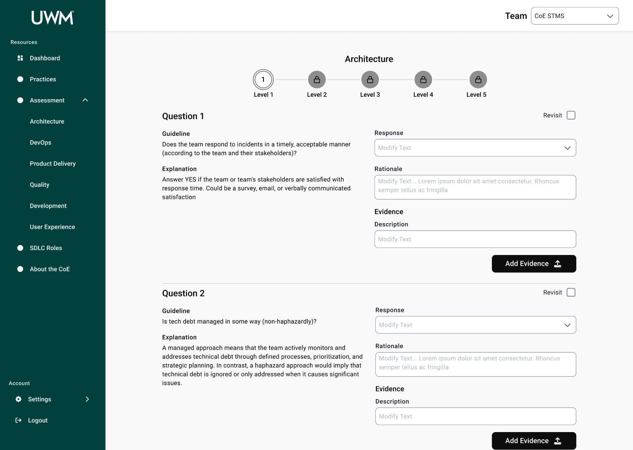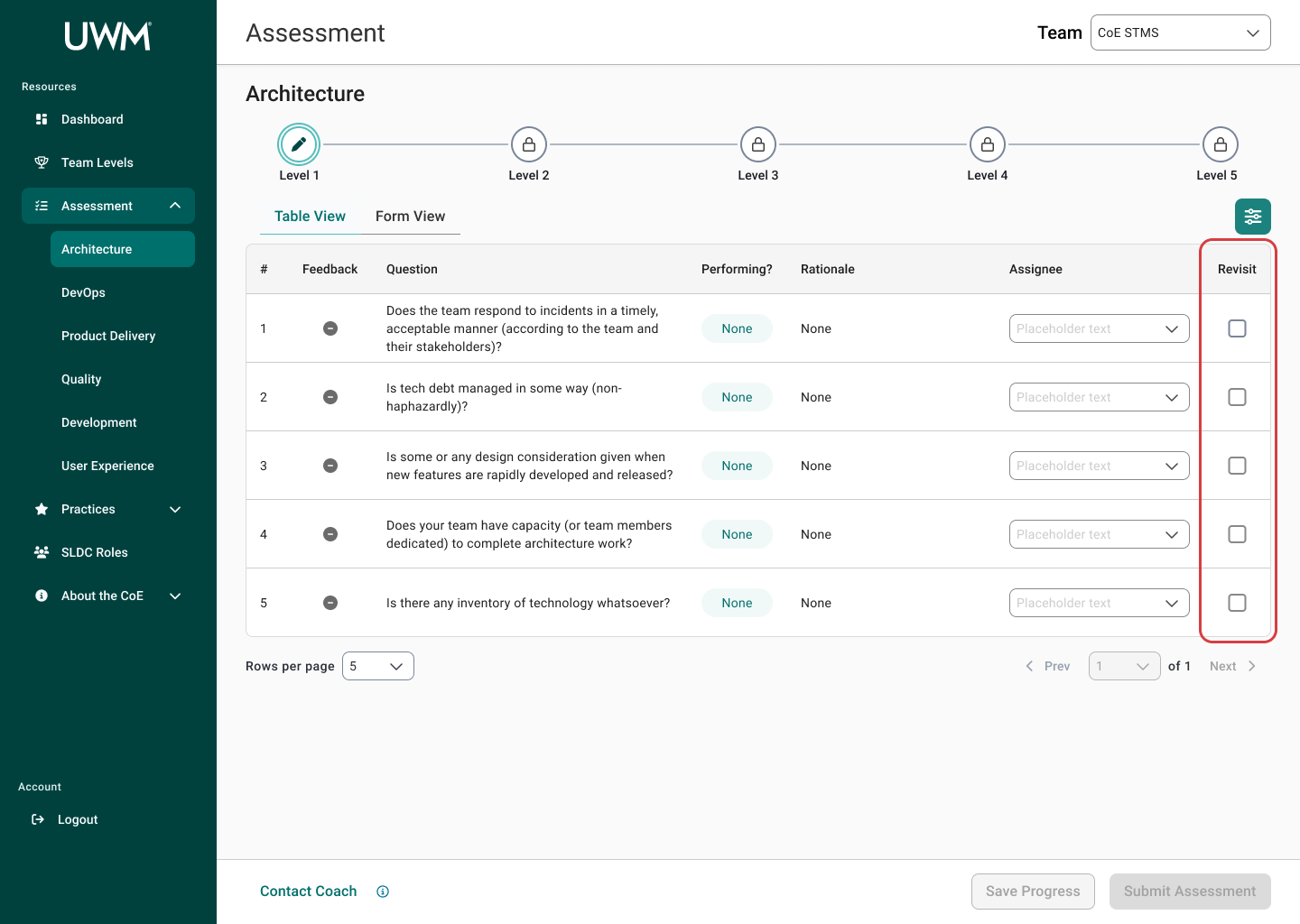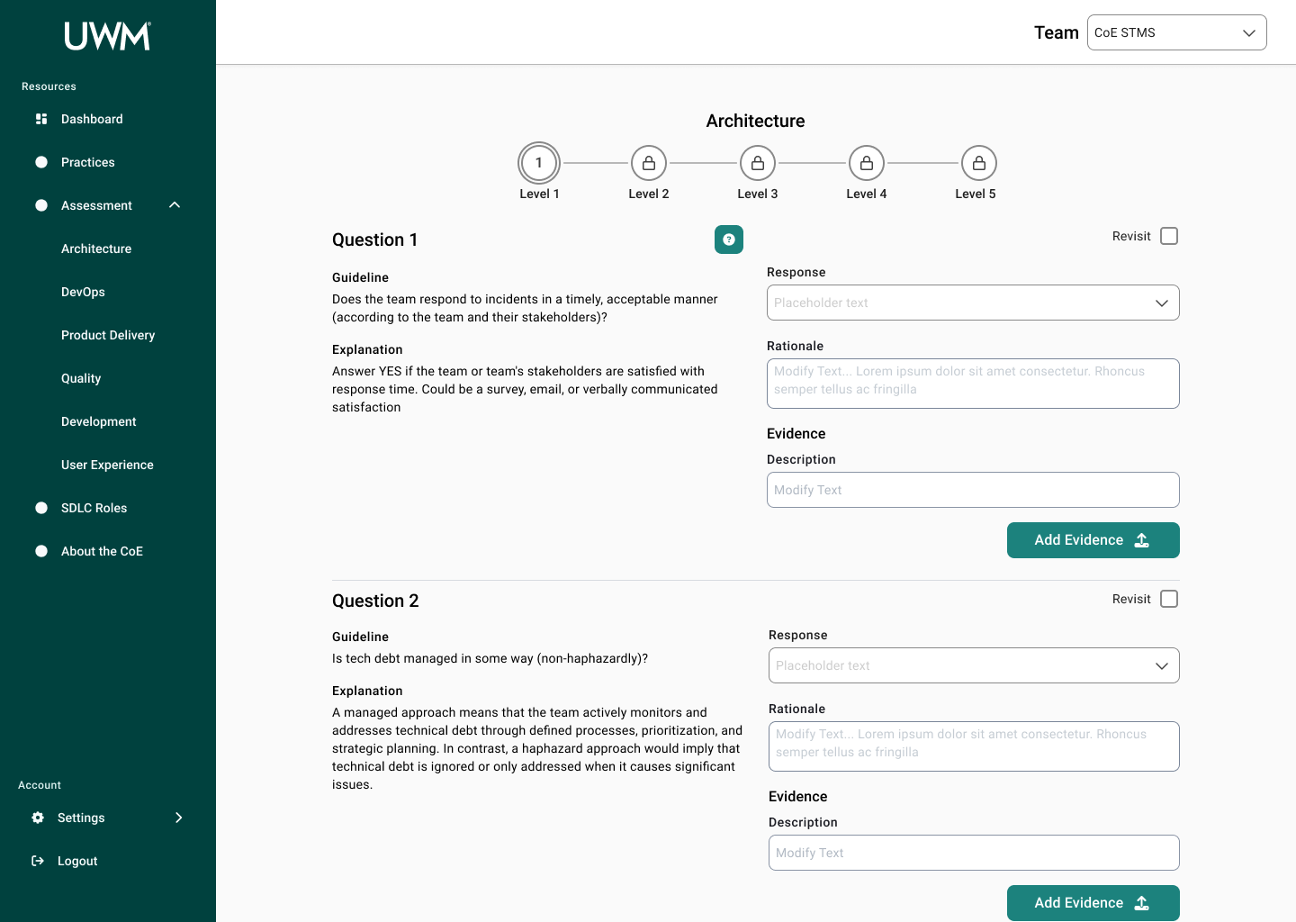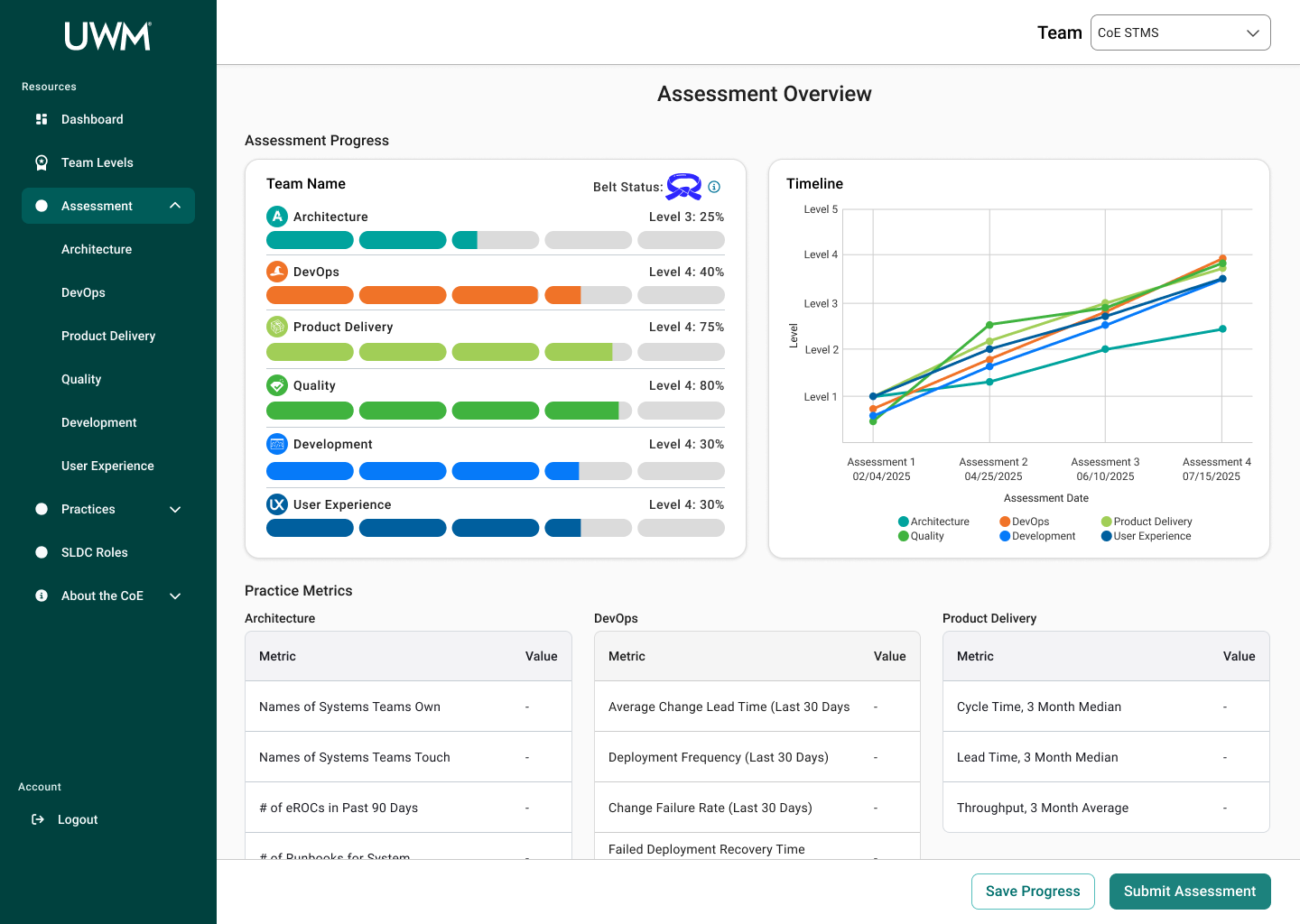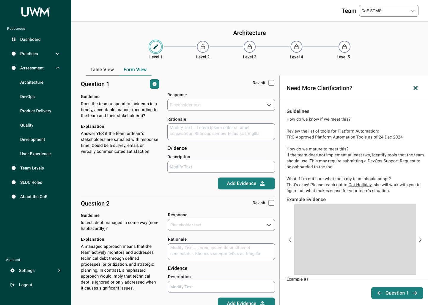 Over the course of this project, I collaborated with many team members, including researchers, designers, and stakeholders to redesign the CoE application for teams to complete assessments to measure their maturity for SDLC standards. This new design will allow teams to efficiently complete assessments, receive coaching feedback, and improve their development practices. In turn, the development teams at UWM can be more cost-effective and time-efficient while also reducing risk.