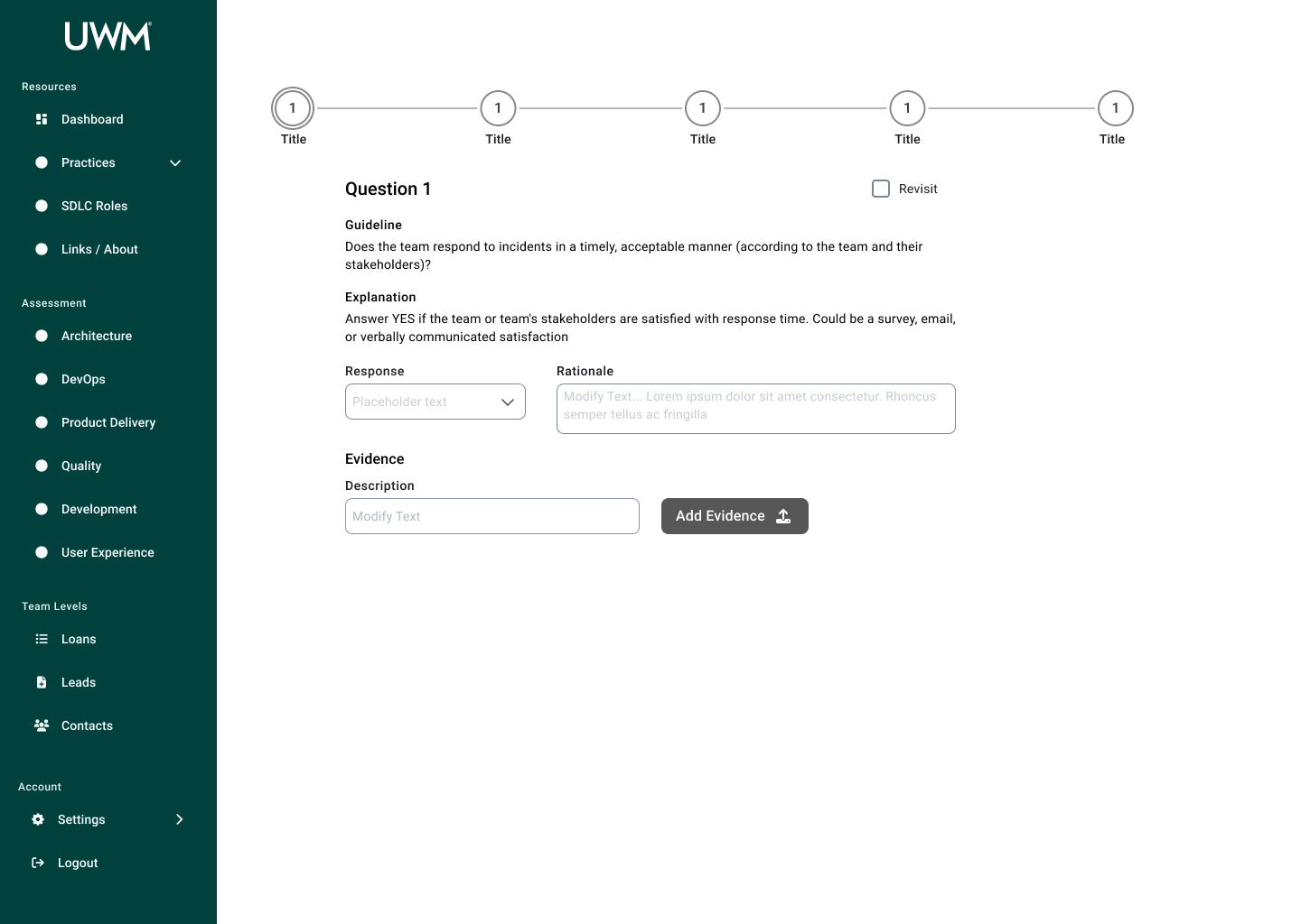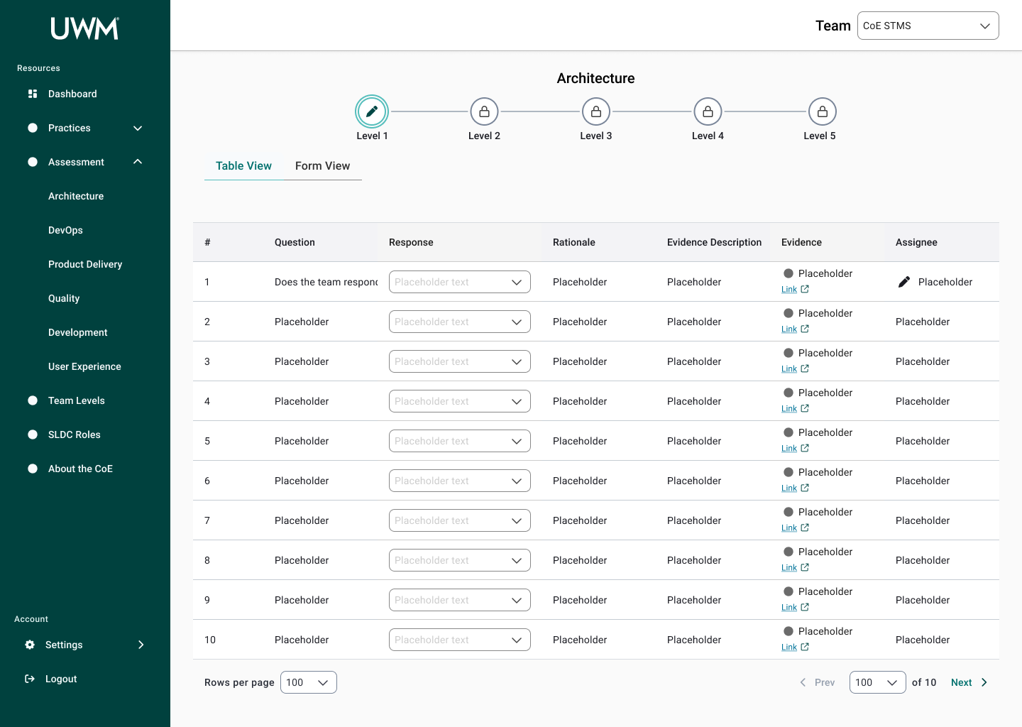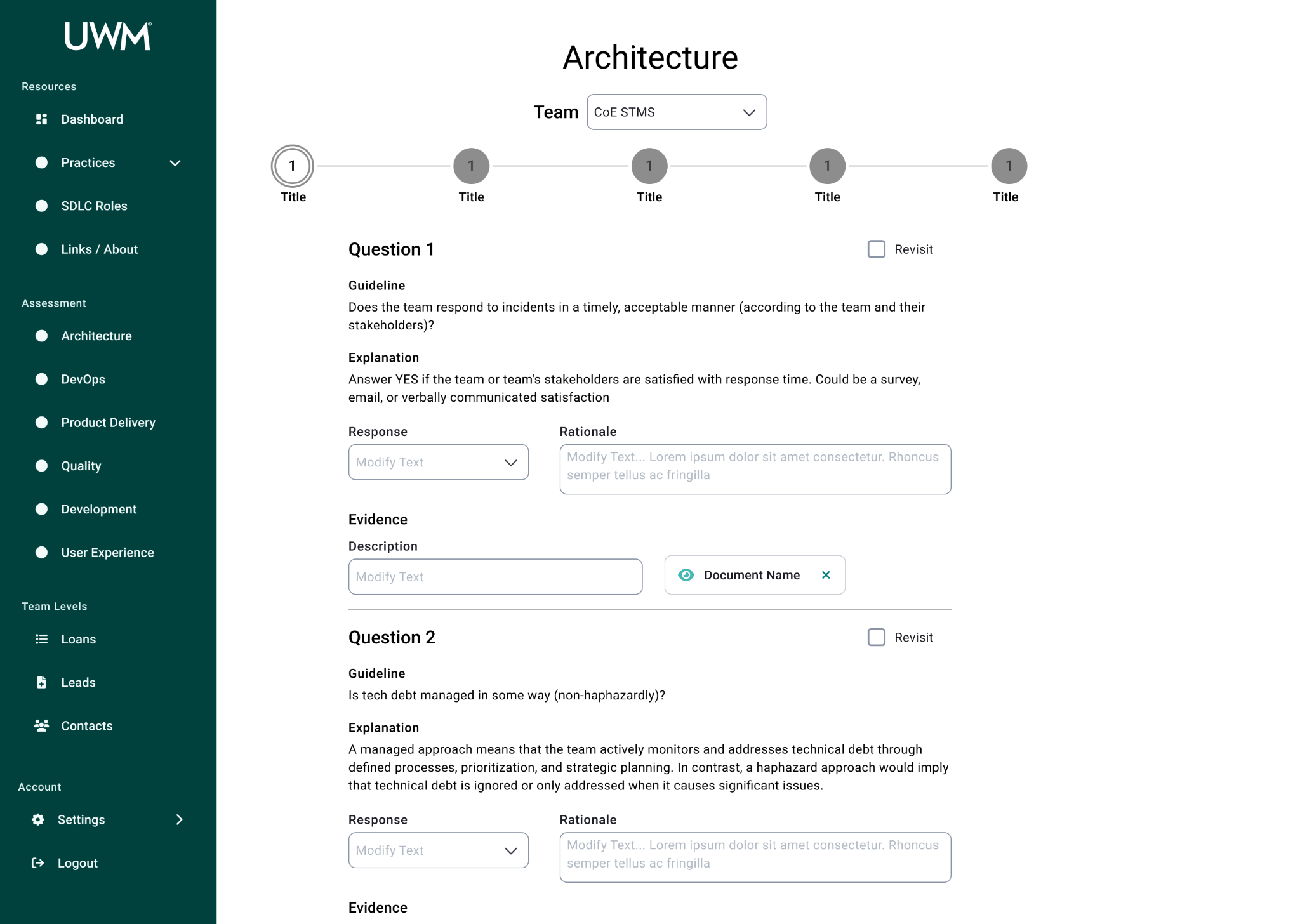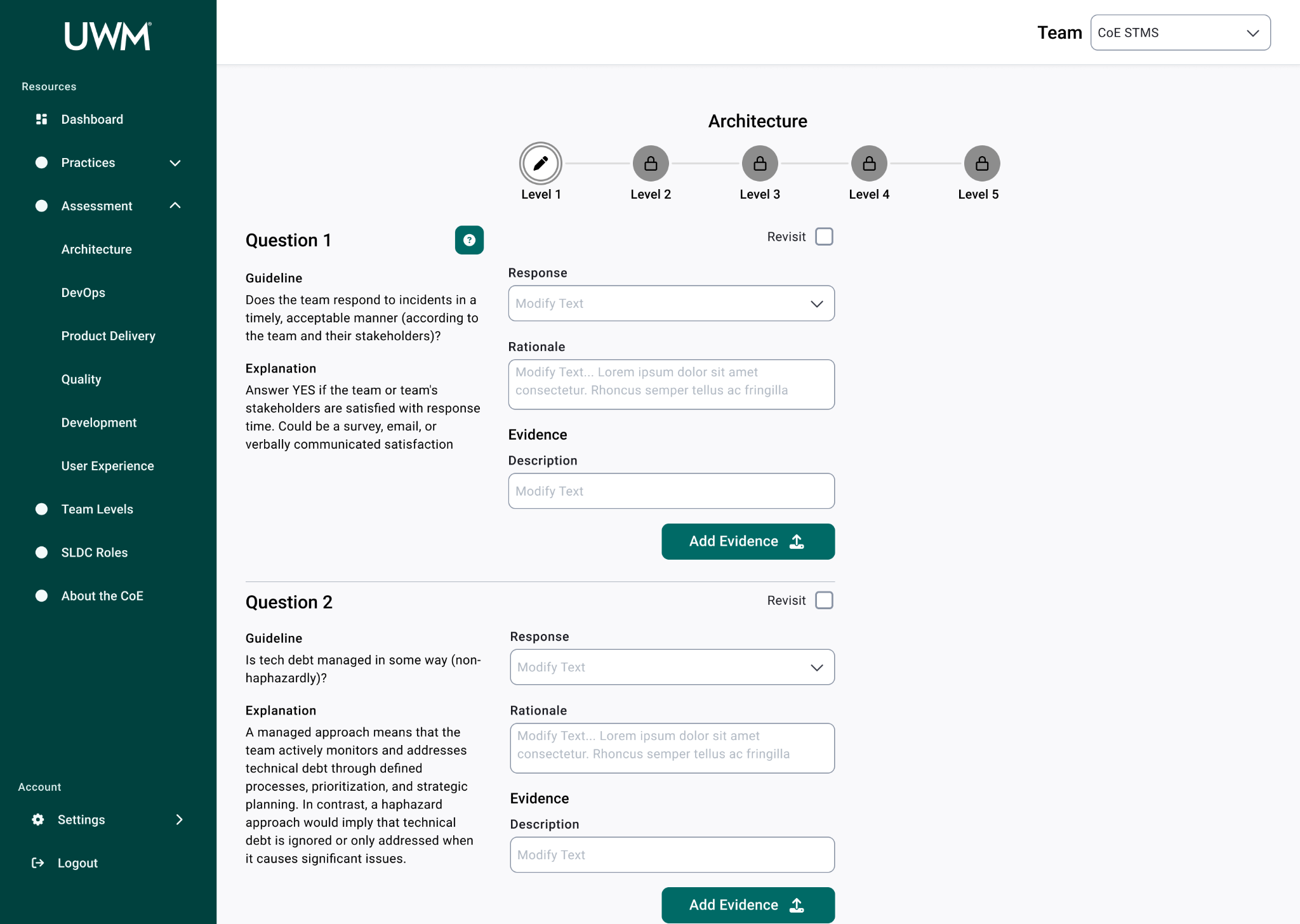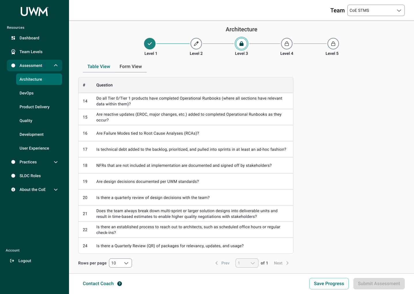 Over the course of this project, I collaborated with many team members, including researchers, designers, and stakeholders to redesign the CoE application for teams to complete assessments to measure their maturity for SDLC standards. This new design will allow teams to efficiently complete assessments, receive coaching feedback, and improve their development practices. In turn, the development teams at UWM can be more cost-effective and time-efficient while also reducing risk.