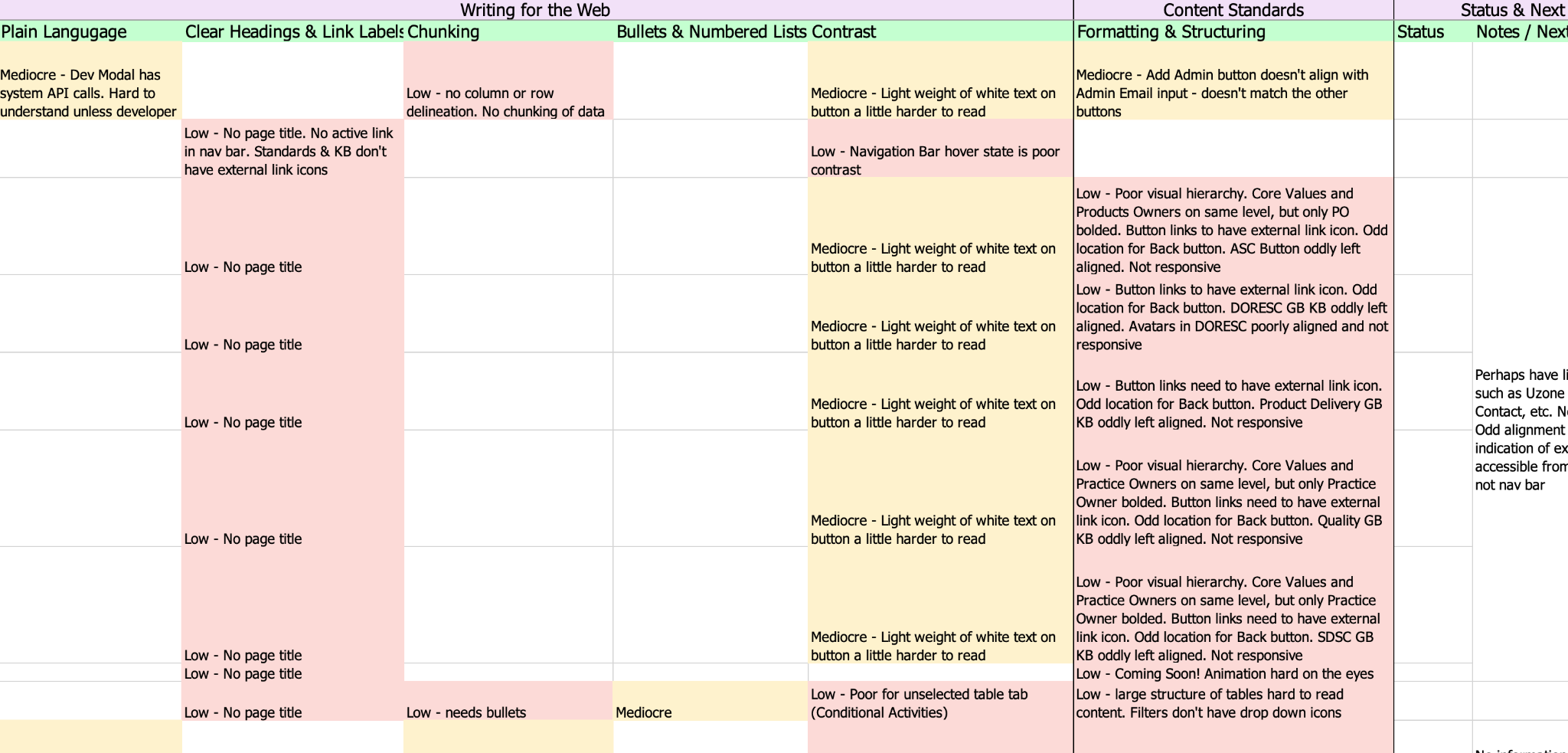 I began the process with a content inventory to understand the pages’ current state as well as familiarize myself with the CoE. Once I completed the content inventory, I went more in depth with a content audit to evaluate for industry best practices, including chunking, contrast, formatting, and structuring. I used the audit as a way to identify ways users may face difficulty using the application. I also noted next steps from the audit, which I used for the pages we would be focusing on in the research phase.
