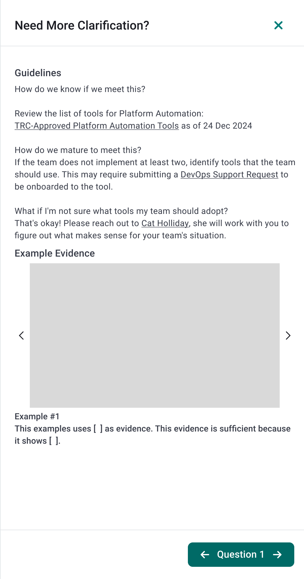 Several users struggled with interpreting the questions listed, including if they met the metric and what would be applicable evidence. Some users were not aware of tooltip hover information for the questions nor the resource pages, which often varied by each practice depending on the coach. A centralized and standardized method for sharing additional information for each question would allow users to answer the questions with less uncertainty.