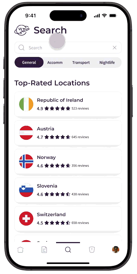I chose to create a T-shaped prototype to give a brief overview of the other pages: Home, Guides, Safety, and Profile. I further built out the Search page, where users can search for information about a location, including general, accommodation, transportation, and nightlife, which were categories pulled from research findings. For this prototype, I used Iris’s persona (Novice) and her journey to design the interactions. In the next section, I break down the main features.