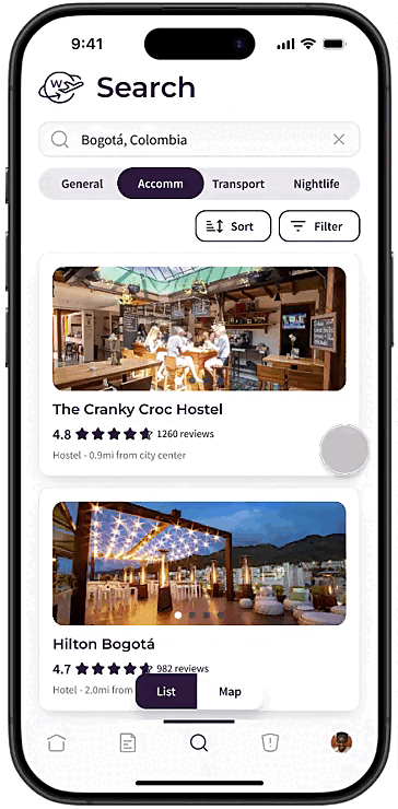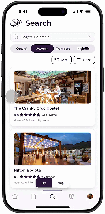 As Iris is looking for a place to stay in Bogota, she can click on the Accommodation tab, where she would see a variety of hotels and hostels. She can view reviews from other women, but she is only looking for experiences from other Black women.