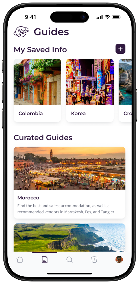 On the Guides page, Iris can view her saved information, including what she has saved for her upcoming trip to Colombia. Below, she can also view curated guides from the WanderWomen team.