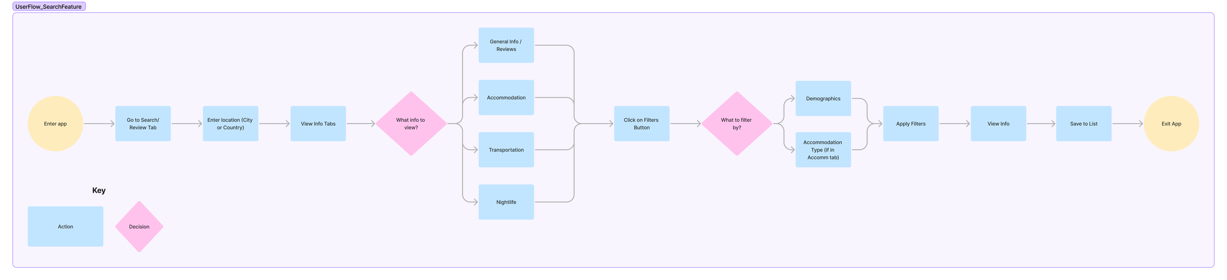 Based on extracted requirements and the user journey maps I created from the previous research, I created a user flow for searching reviews. Because so much information would be housed within the featured reviews, I used the user flow to break down how I should go about with filtering and the steps a traveler would take to find information relevant to their needs.