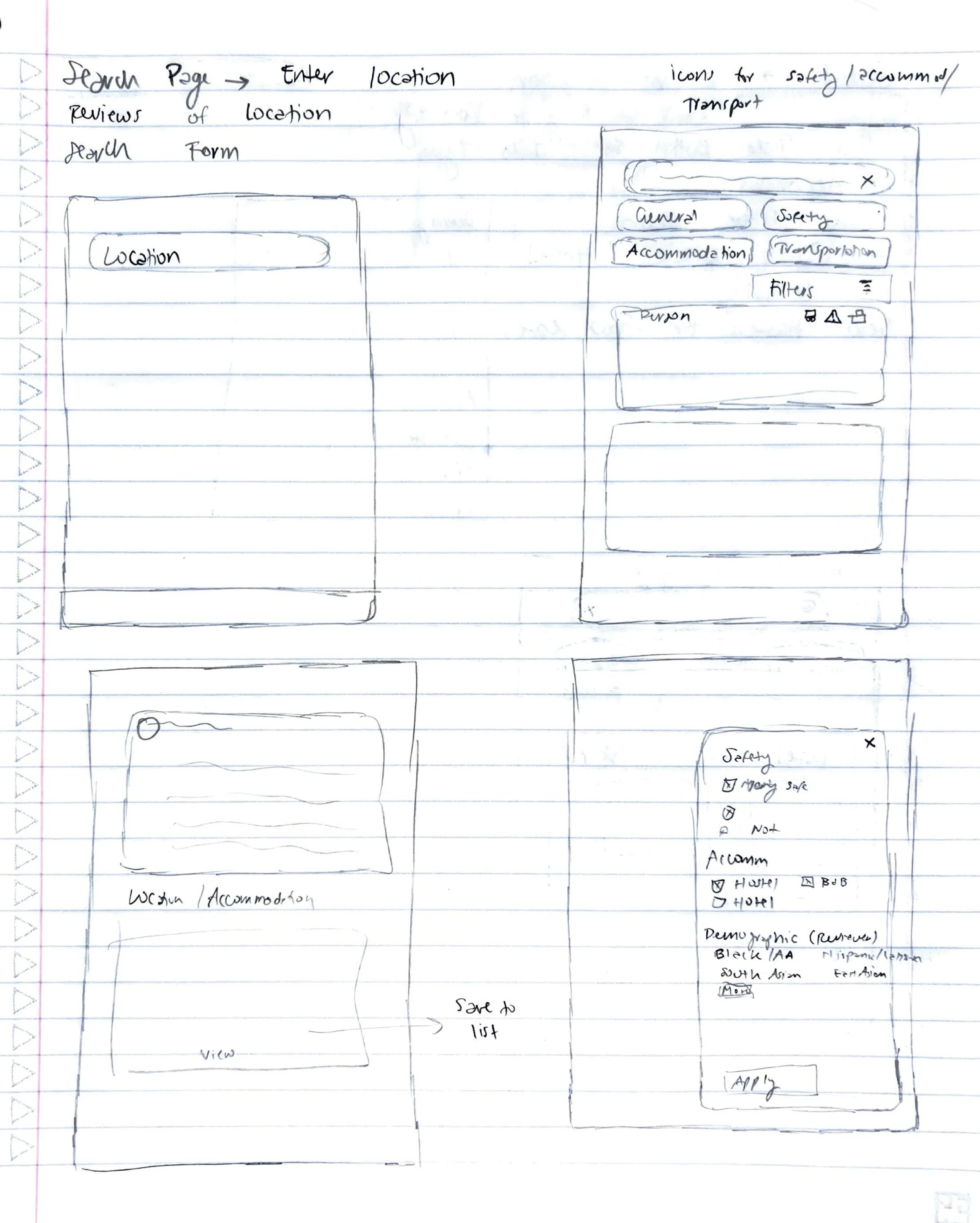 For our first round, we conducted an observational study to understand the process the travelers take when planning for a trip, and we asked how they would plan a solo travel trip to a destination of their choice with safety considerations in mind. We recruited participants experienced in solo travel and those interested but who have not yet.