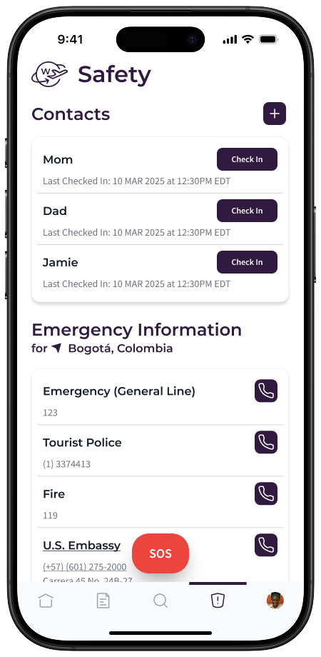 Iris can view emergency information for Bogota, which has relevant phone numbers and information on the embassy. While in Colombia, she can check in with friends and family or use the SOS function to contact local authorities.